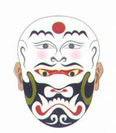 “僧脸”又名“和尚脸”。特征是腰子眼窝 花鼻窝 花嘴岔,脑门勾一个舍利珠圆光或九个点,表示佛门受戒。